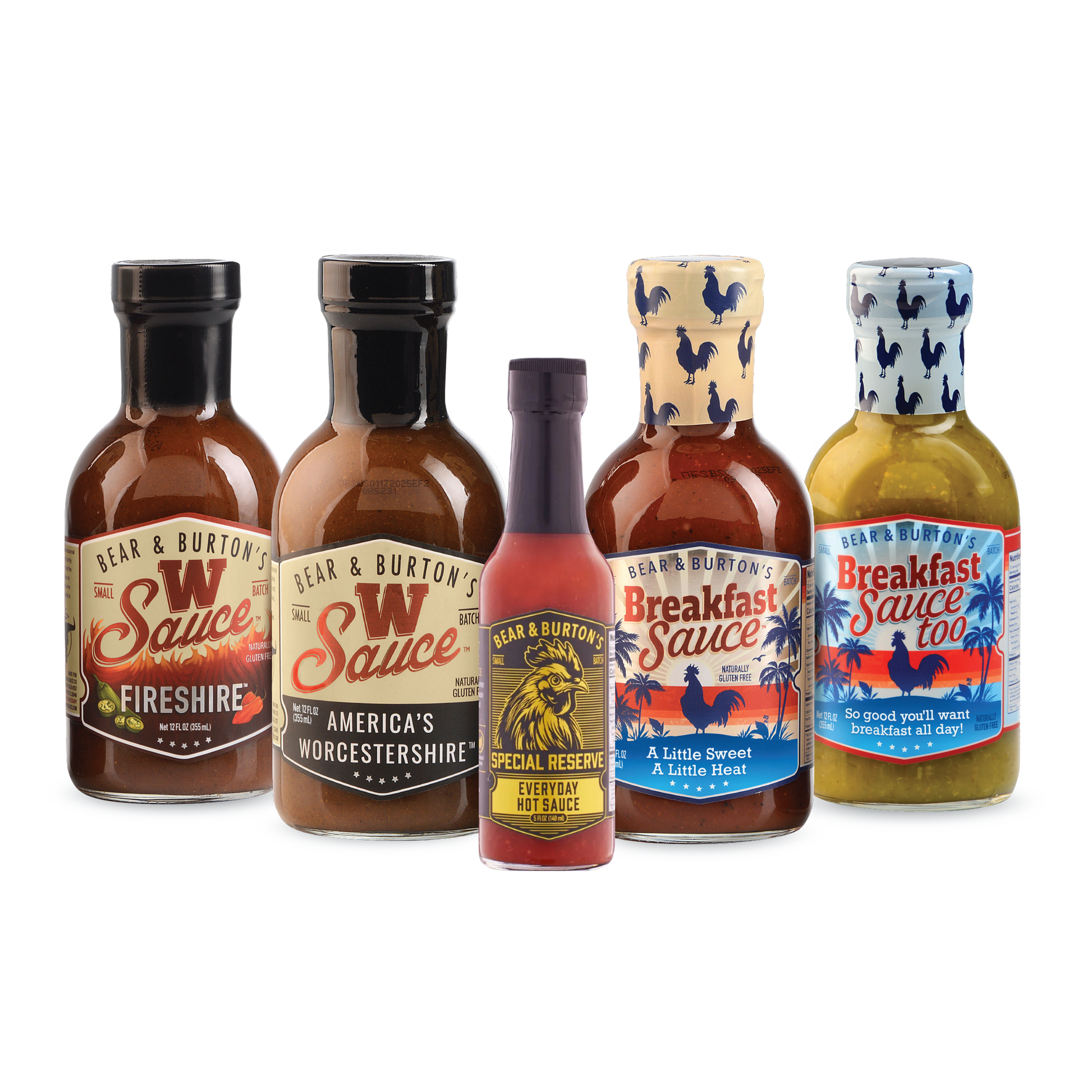- 5 Pack Sampler: W Sauce 12oz / Fireshire 12oz / Breakfast Sauce 12oz / Breakfast Sauce Too 12oz / Everyday Hot Sauce 5oz