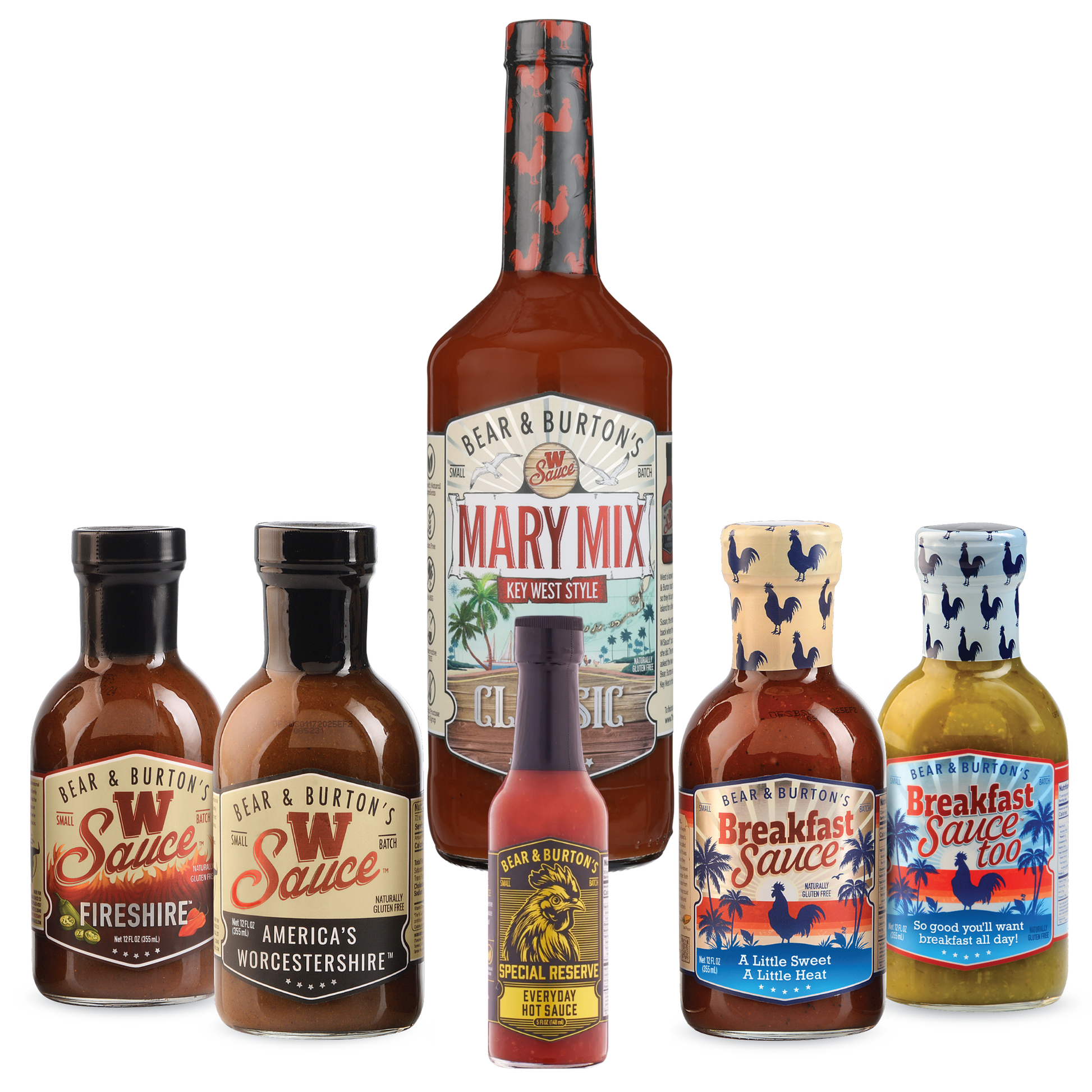 - 5 Pack Sampler + Mary Mix: W Sauce 12oz / Fireshire 12oz / Breakfast Sauce 12oz / Breakfast Sauce Too 12oz / Everyday Hot Sauce 5oz / Mary Mix 32oz