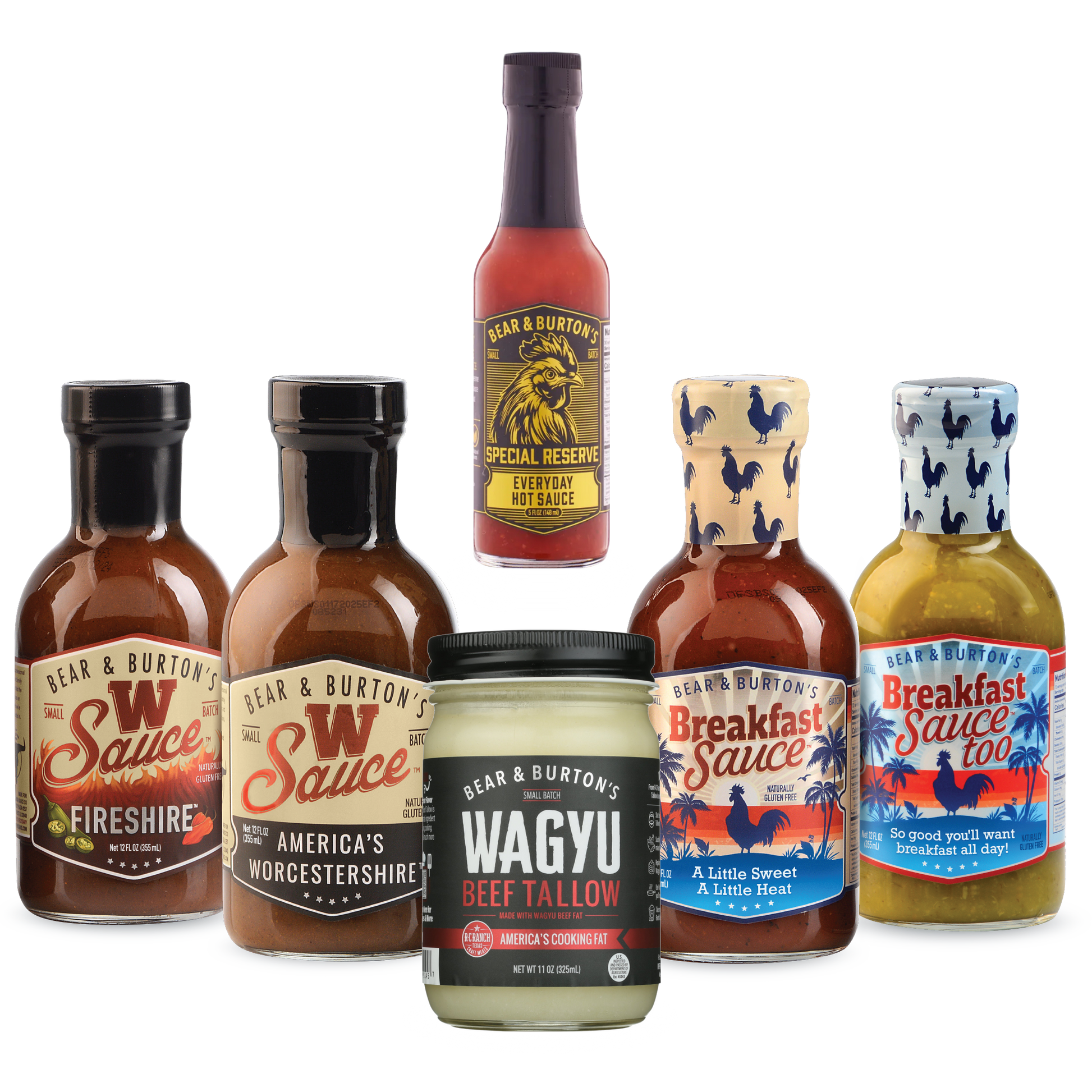 - 6 Pack Sampler: W Sauce 12oz / Fireshire 12oz / Breakfast Sauce 12oz / Breakfast Sauce Too 12oz / Everyday Hot Sauce 5oz / Wagyu Beef Tallow 11oz