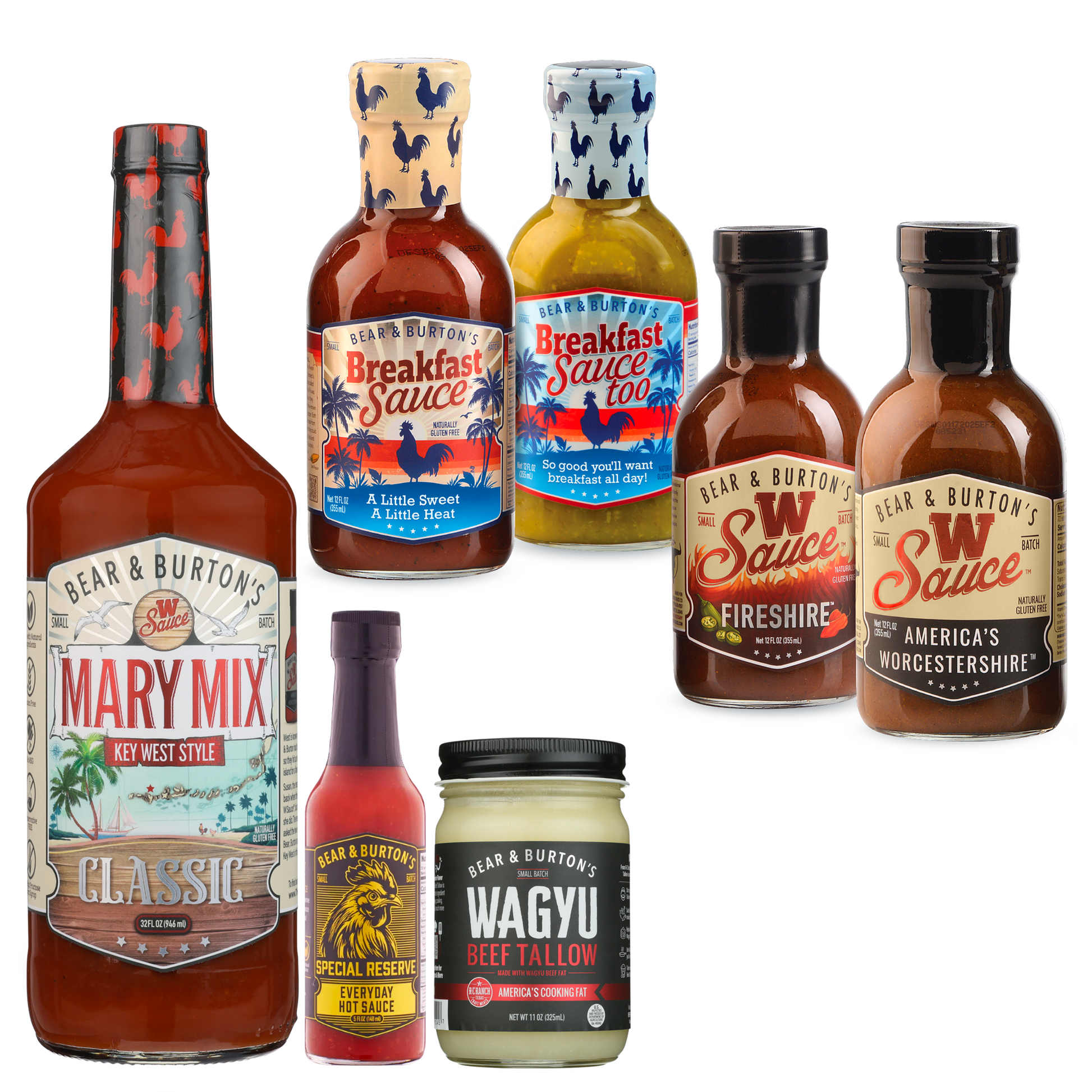 - 6 Pack Sampler + Mary Mix : W Sauce 12oz / Fireshire 12oz / Breakfast Sauce 12oz / Breakfast Sauce Too 12oz / Everyday Hot Sauce 5oz / Wagyu Beef Tallow 11oz / Mary Mix 32oz